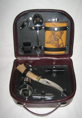В комплект вхрдит:нож охотничий,4 стопки,нож складной многофункциональный со штопором,карты,фляжка,воронка для фляжки,4 ложки.