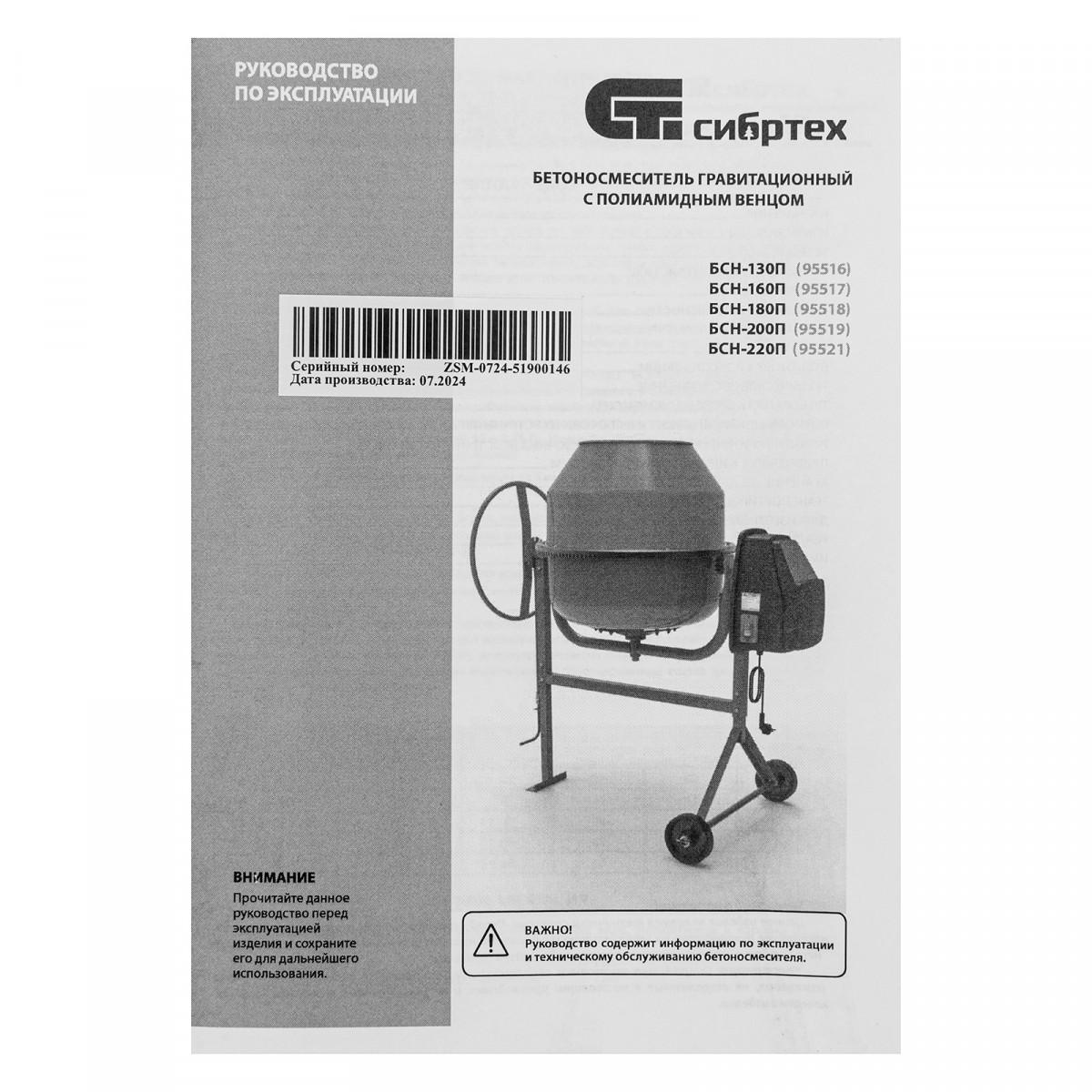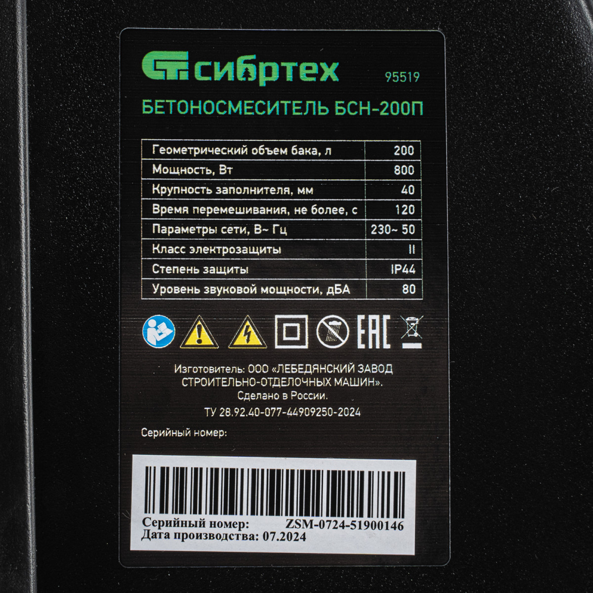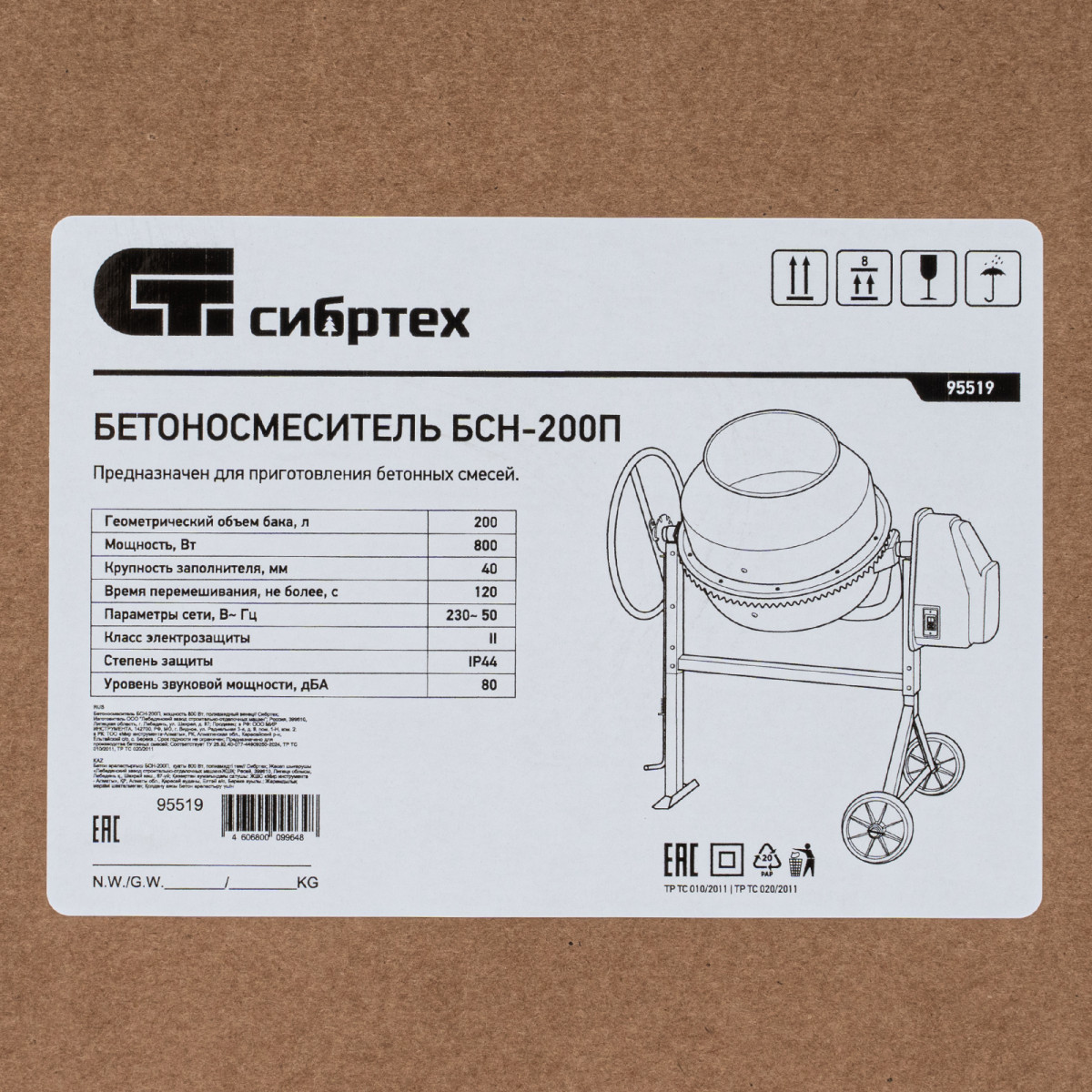 Бетоносмеситель БСН-200П, мощность 800 Вт, полиамидный венец Сибртех