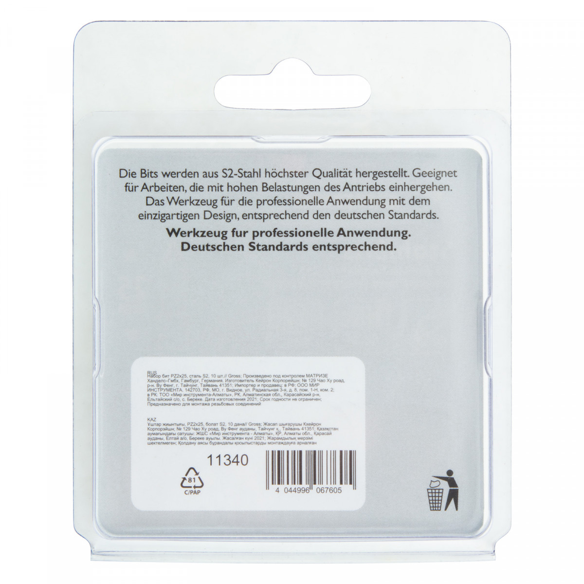 Набор бит Gross 11340 состоит из 10 насадок типоразмера PZ2 и длиной 25 мм, с хвостовиком 1/4 дюйма, изготовленных из стали S2 и предназначенных для шуруповертов. Оснастки служат для монтажа и демонтажа шурупов, саморезов и других резьбовых соединений. Шлиц PZ имеет 4 дополнительных ребра, благодаря чему предотвращается проскальзывание биты в крепеже, повышаются точность и эффективность работ.