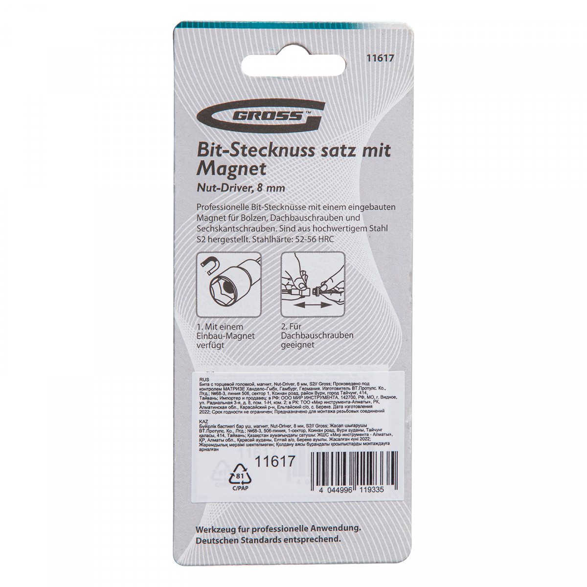 Бита с торцевой головкой Gross Nut-Driver 11617 из стали S2, размером 8 мм, с магнитом, применяется в качестве профессиональной оснастки для шуруповертов. Она предназначена для монтажа и демонтажа болтов, шурупов и кровельных саморезов, имеющих шестигранную головку. Насадка выдерживает интенсивные нагрузки и сохраняет рабочие свойства даже при длительном использовании.