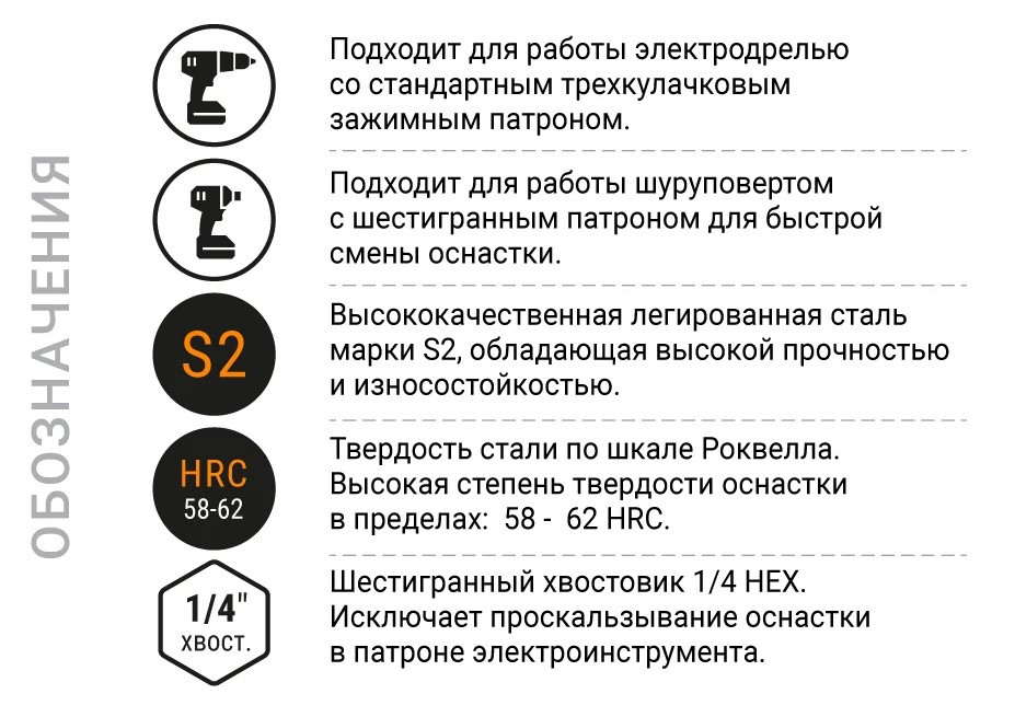 Изготовлена из легированной стали марки S2 с твёрдостью 58-62 HRC для повышенной прочности и износостойкости.