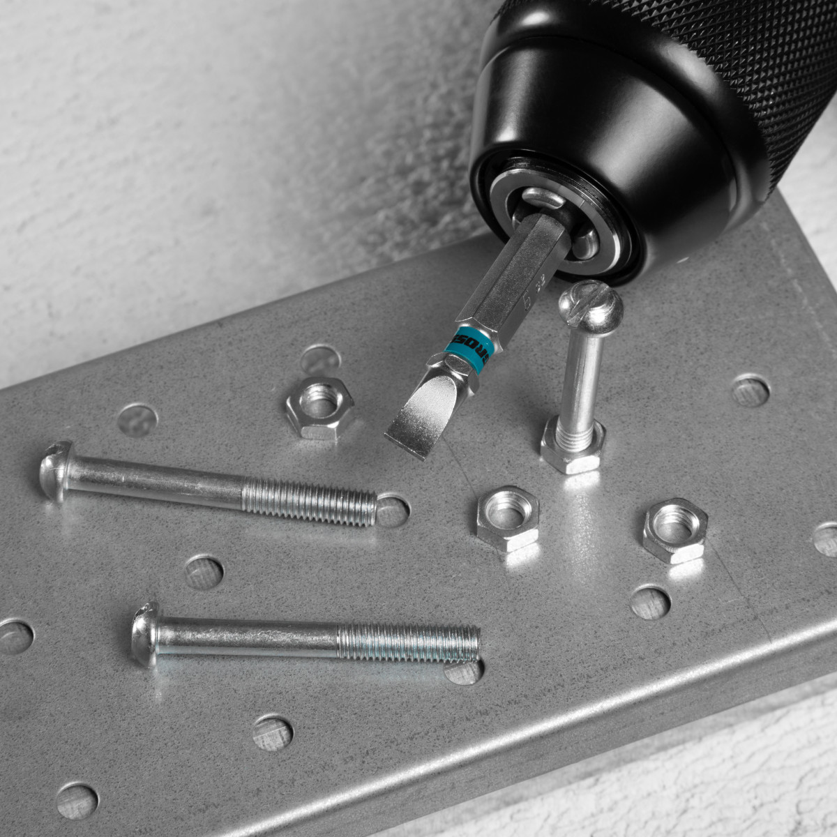 - Коррозионная стойкость — никелевое покрытие защищает биты от воздействия влаги.
