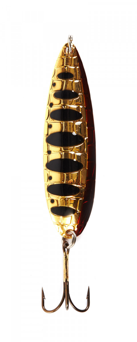 Lucky John Croco Spoon - узкотелая колеблющая блесна, с изогнутым профилем хвостовой части.Блесна прекрасно летит при забросе и размашисто играет при проводке.Внешняя сторона приманки, выполненная в виде рельефной поверхности с нанесенным на нее рисунком, хорошо привлекает хищную рыбу с большого расстояния.Блесны CROCO SPOON разработаны в четырех размерах и имеют различную толщину тела. Их вес составляет: 14, 18, 22 и 26 грамм.Длина и толщина используемого в приманке металла, позволяют использовать блесны в различных условиях спиннинговой ловли. Так, более легкую приманку эффективнее применять при ловле на мелководье, вблизи зарослей водной растительности. Тяжелая блесна прекрасно работает в придонных слоях водоема, на глубинах 3 – 5 м.Любой вид проводок: равномерная, прерывистая или ступенчатая, хорошо сочетается с блеснами CROCO SPOON.Самая легкая блесна, весом 14 грамм, с успехом применяется и зимой, при ловле судака со льда.