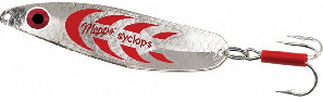 "SYCLOPS — одна из лучших колеблющихся блесен в мире, имеющая превосходно отработанную форму. Старинные прототипы, схожие с этой блесной, в наше время практически не сохранились. SYCLOPS унаследовал от них двойной прогиб в горизонтальной проекции, обеспечивающий при проводке максимальное сходство с движениями живой рыбы. Блесна не имеет мягкого профиля, ее форма образована сопряжением плоскостей, в том числе, образующих в хвостовой части «ребро устойчивости», гарантирующее SYCLOPS устойчивую, без «свалов», игру как на спокойной воде, так и при любой скорости течения. Благодаря идеально расположенному центру тяжести и удачному соотношению между весом и площадью приманки, все размеры SYCLOPS сохраняют превосходную игру даже при свободном падении после прекращения проводки. Как известно при ловле лосося и щуки такой приём бывает незаменим. Кроме того, эффект от движения блесны значительно усиливается за счет игры света, отражаемого плоскостями.