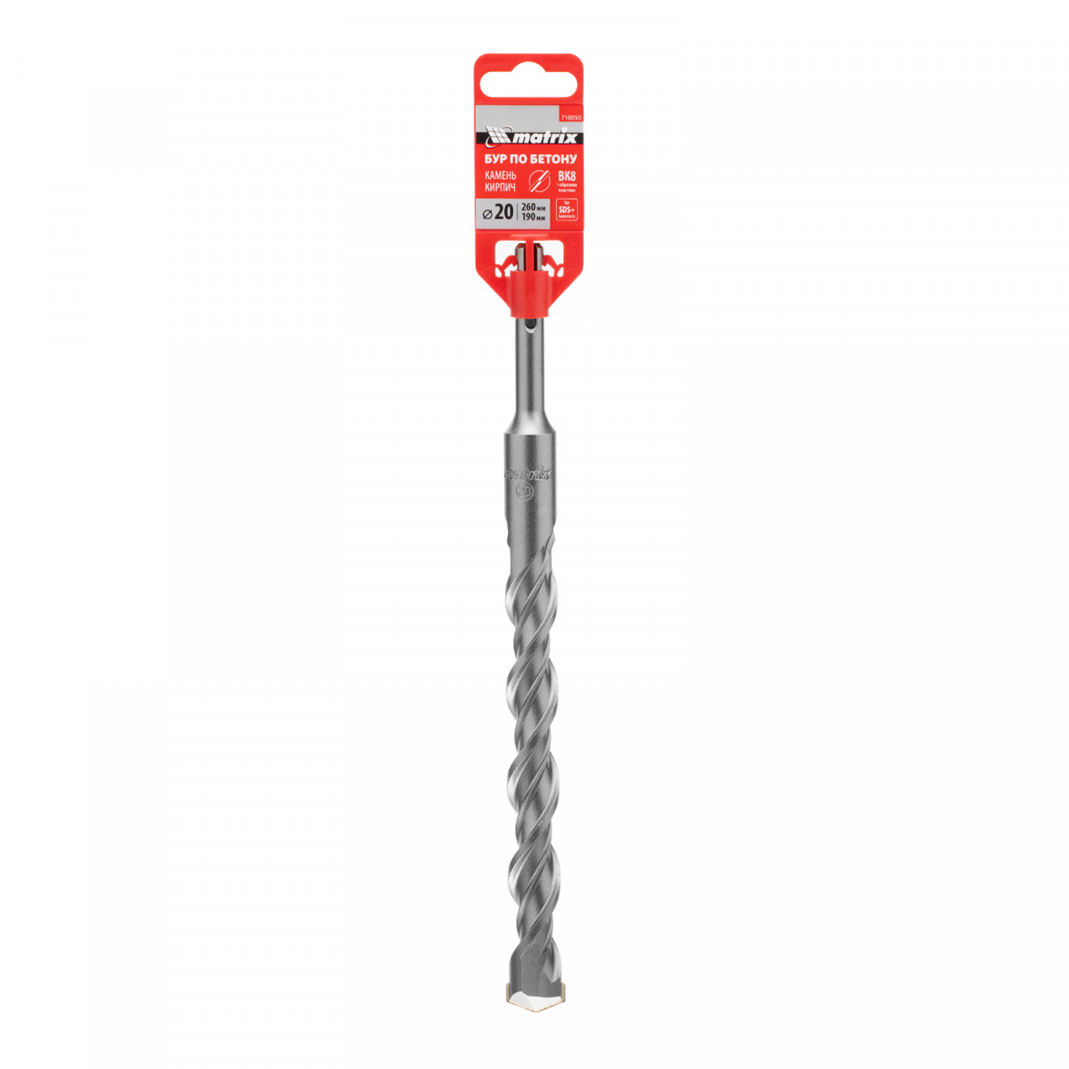 Бур по бетону Matrix 710050 длиной 260 мм, с хвостовиком SDS-plus, предназначен для установки на перфоратор и получения отверстий диаметром 20 мм в бетоне, камне и кирпиче. Позволяет эффективно решать поставленные задачи благодаря режущей пластине из высокотвердого сплава карбида вольфрама ВК8 твердостью 80-90 HRC.