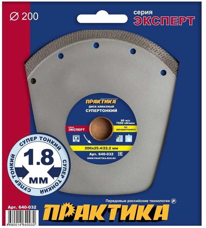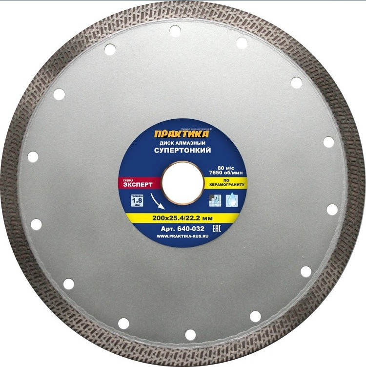 Алмазный диск Практика Эксперт Супер тонкий 640-032 представляет собой специализированный турбированный диск для профессионального применения. Используется для работ по керамическому граниту, плитке, различным изделиям из керамики. Применяется совместно с настольными пилами и ручным инструментом. Диаметр изделия составляет 200 мм.