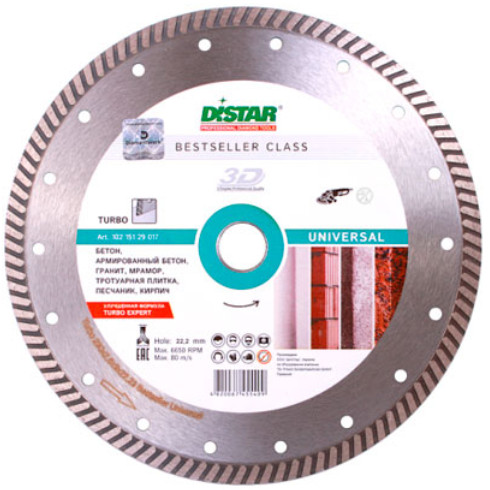 Диск отрезной алмазный относится к серии Turbo Bestseller Universal и представляет собой высококачественный профессиональный инструмент, предназначенный для резки бетона, армированного бетона, всех видов гранита и песчаника, тротуарной плитки. Диск одинаково стабильно может справляться как с резкой бетона, так и гранита. Он имеет высокий ресурс и уверенно поддерживает скорость резки. Для работы на УШМ.