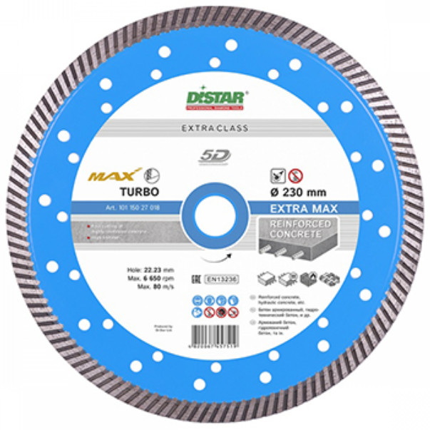 Универсальный алмазный диск Дистар ExtraMax с алмазной турбо-кромкой высотой 12 мм. Предназначен для резки бетона, железобетона, кирпича, песчаника и тротуарной плитки. Обеспечивает легкий рез без сколов и повреждений материала. Эксплуатируется на различном режущем оборудовании с присоединением 22,2 мм. Корпус оснащен дополнительными отверстиями для эффективного охлаждения.