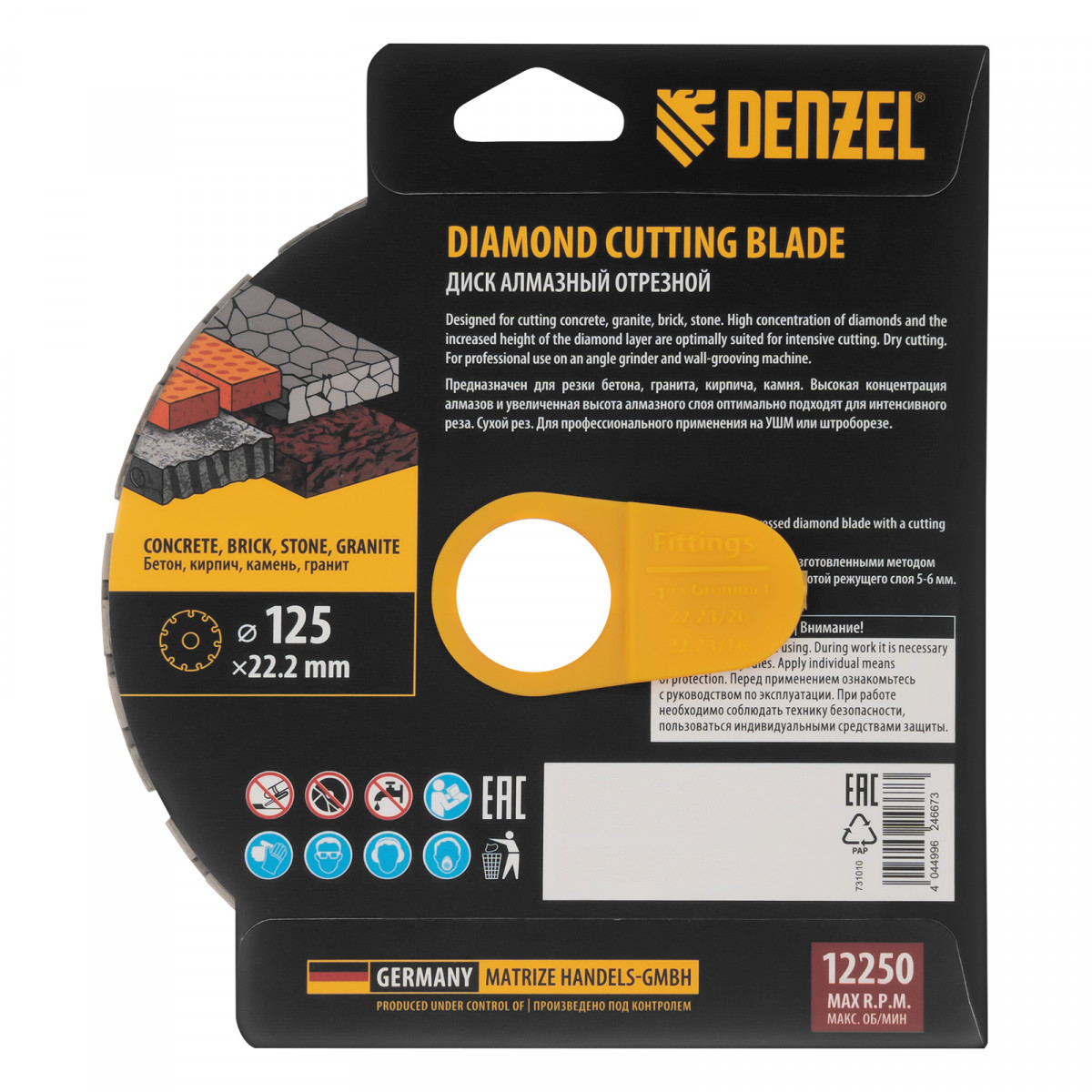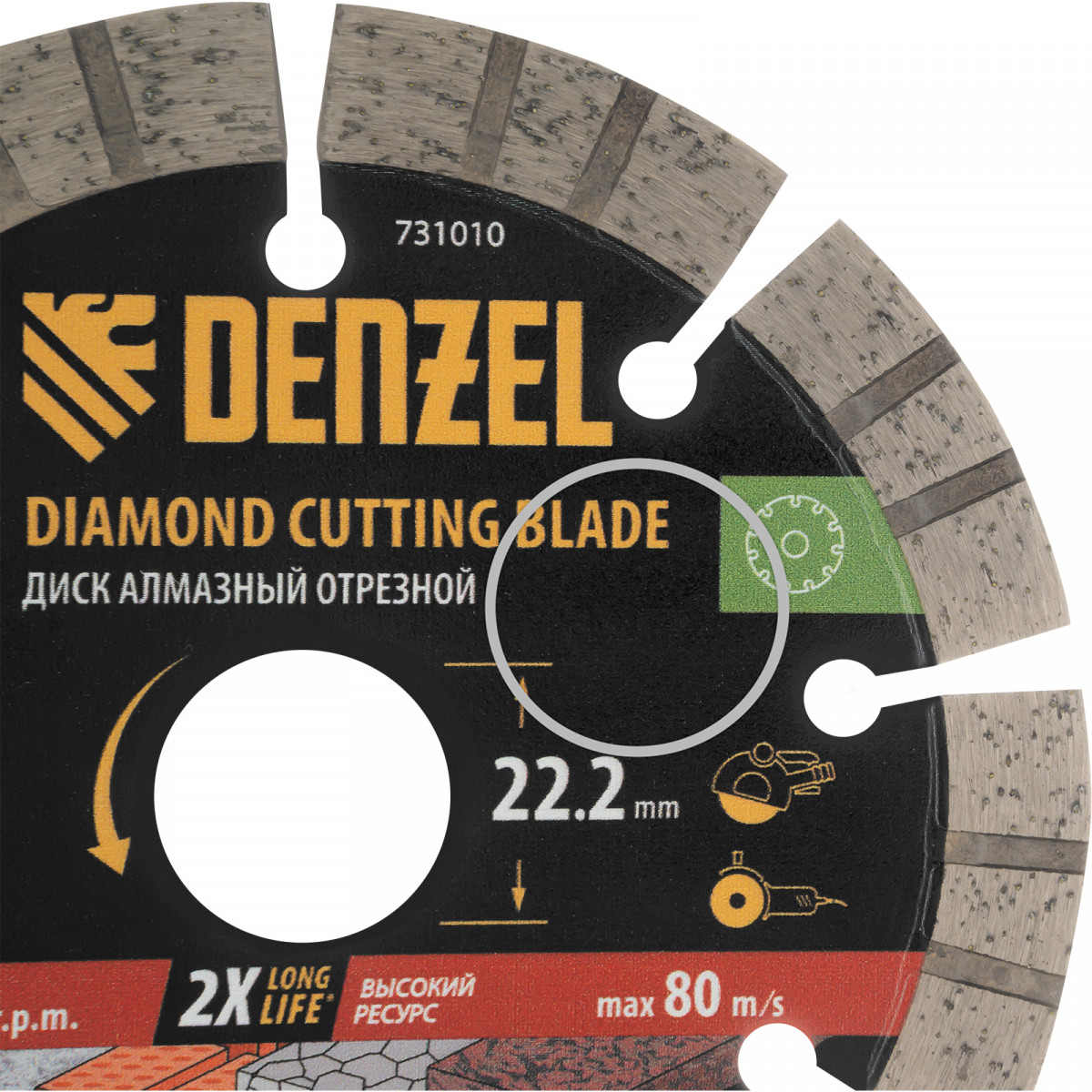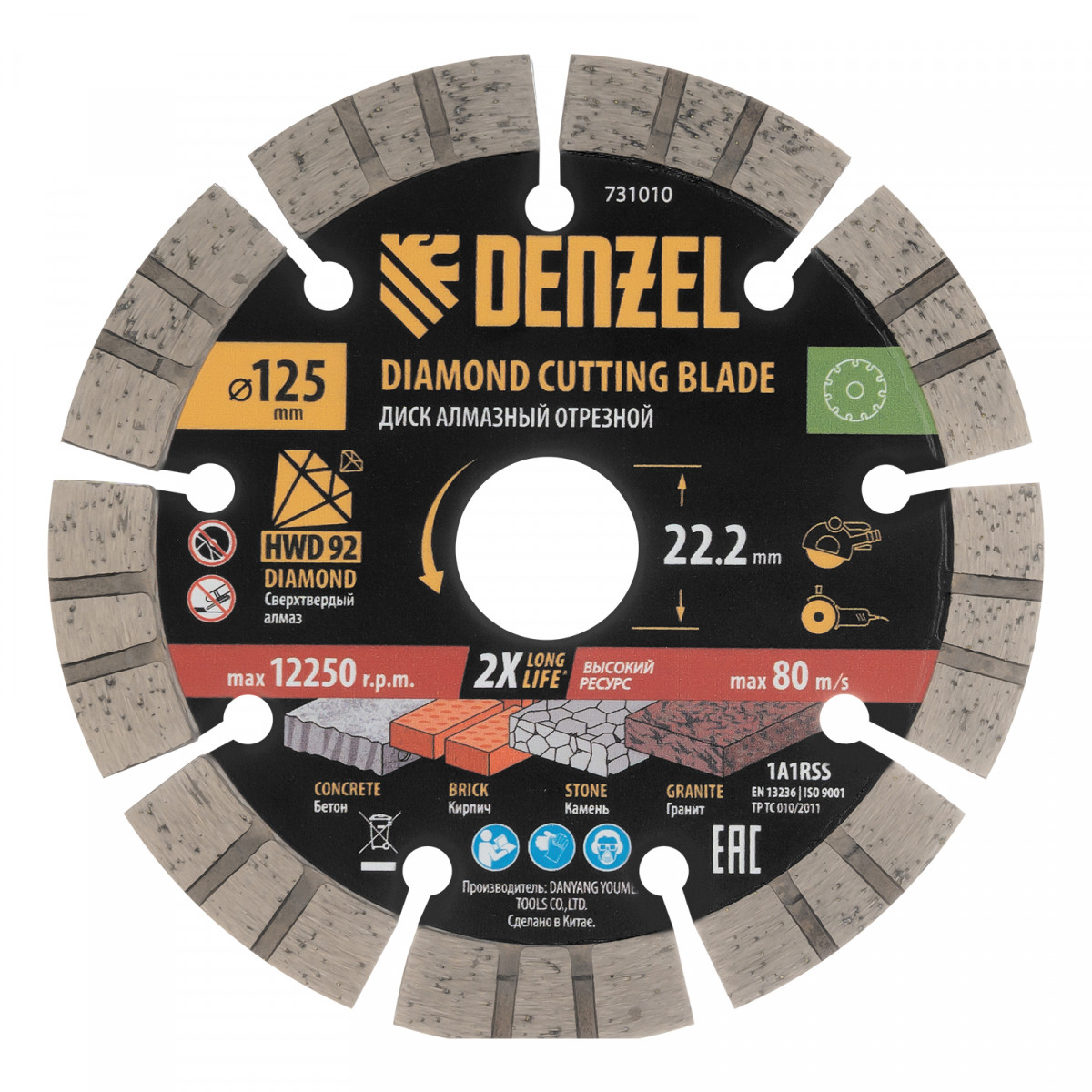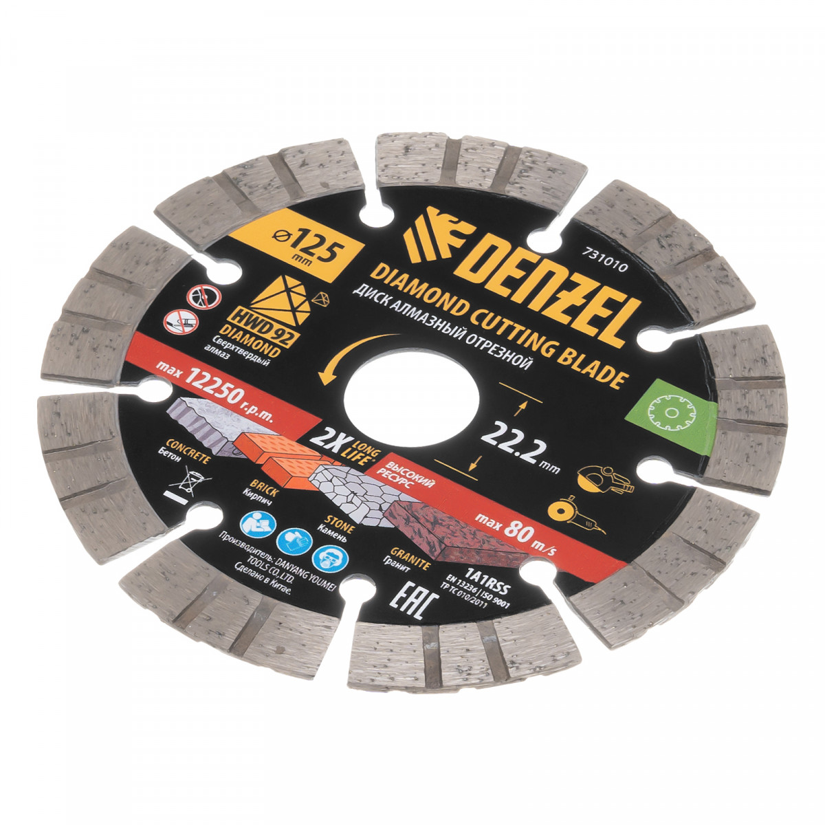 Алмазный отрезной диск Denzel 731010 диаметром 125 x 22,2 мм, с сегментной рабочей частью и слоем сверхтвердых алмазов HWD92, предназначен для сухого резания бетона, камня, кирпича, гранита. Используется с углошлифовальной машиной (УШМ) или штроборезом, поддерживающими частоту вращения 12250 об/мин.