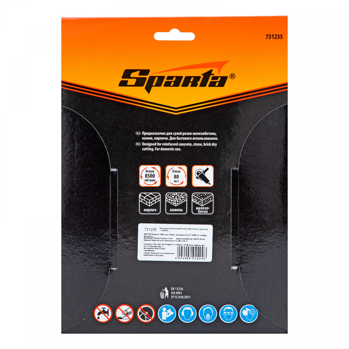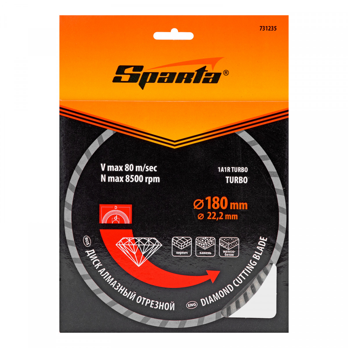 Алмазный отрезной диск Sparta Turbo 731235 для сухой резки, диаметром 180 х 22,2 мм, устанавливается на углошлифовальную машину. Позволяет резать твердые материалы: бетон, железобетон, камень, песчаник. Диск предназначен для бытового использования.