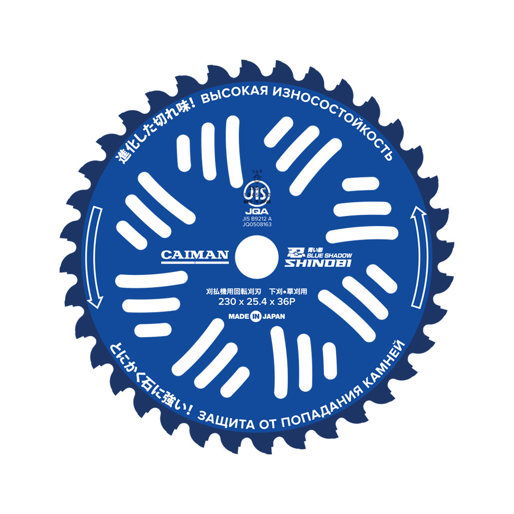 Стальной японский диск Shinobi Blue Shadow Caiman 9" 230x25x36P для бензокос (арт. 0325C).Диск предназначен для срезания жесткой травы и кустарника, при этом он отличается высоким ресурсом и длительным временем работы без заточки. Он соответствует японским промышленным стандартам JIS и полностью готов к работе (заточка не требуется).