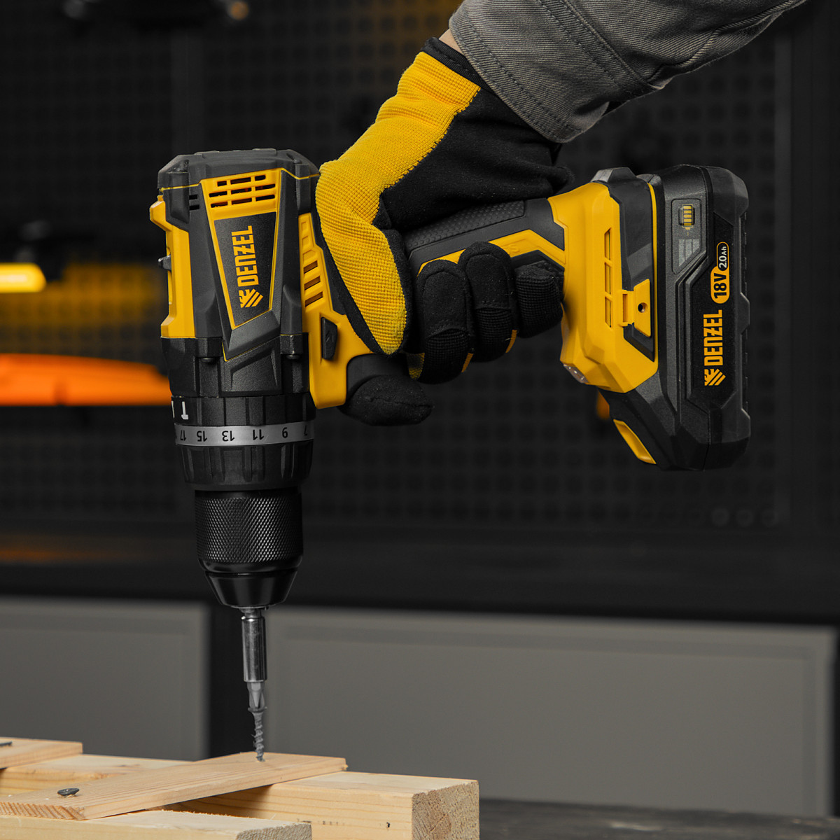 Дрель-шуруповерт аккумуляторная ударная Denzel CIDB-IB-18-02 26130 оснащена бесщеточным двигателем и поставляется с 2 аккумуляторами Li-Ion 18 В. Предназначена для закручивания и откручивания винтов и шурупов, а также для сверления отверстий в металлических, деревянных, пластиковых и других конструкциях. Мощный бесщеточный двигатель обеспечивает крутящий момент 65 Нм, ударная функция позволяет сверлить отверстия в кирпиче и прочих твердых материалах. Максимальный диаметр сверления в металле составляет 13 мм, в древесине — 35 мм, в кирпиче — 13 мм. Аккумуляторы с интеллектуальной системой распознавания нагрузки обеспечивают стабильную работу дрели-шуруповерта на протяжении всего срока службы.