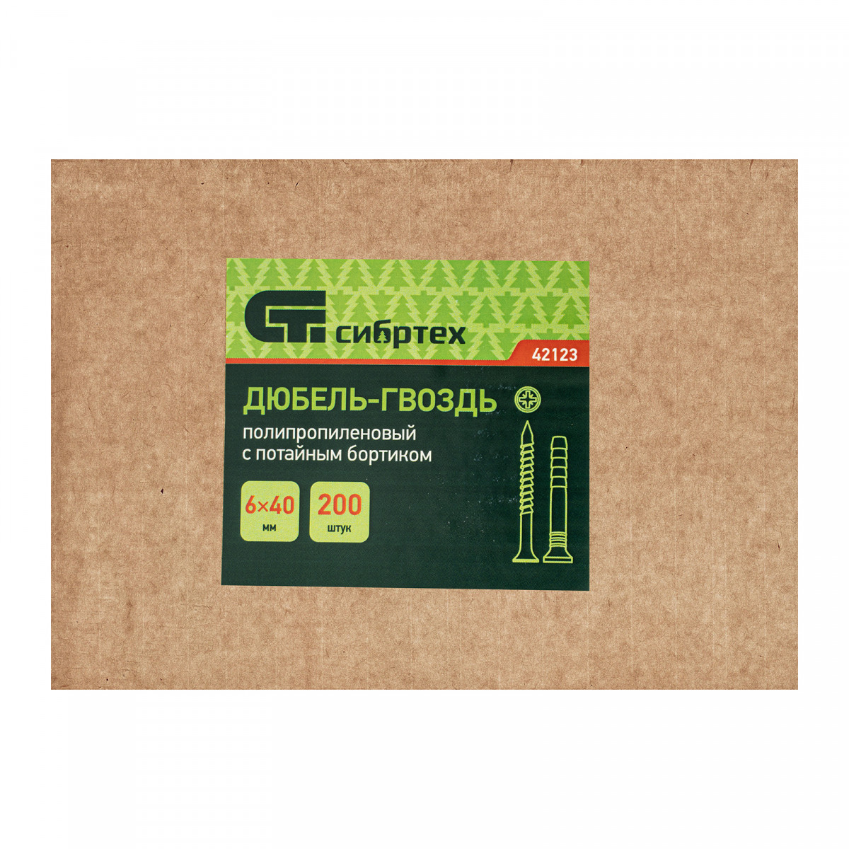 Полипропиленовый дюбель-гвоздь Сибртех 42123 с потайным бортиком, размером 6 х 40 мм, 200 шт. в упаковке, предназначен для закрепления деталей и конструкций на основаниях из бетона, кирпича или камня. Потайной бортик дюбеля обеспечивает максимальный контакт крепежа с прикрепляемым материалом. В комплект поставки входят саморезы со шляпкой типоразмера PZ2. Дюбель-гвоздь применяется при проведении строительных и ремонтных работ, прокладке сетей, а также для решения бытовых задач.