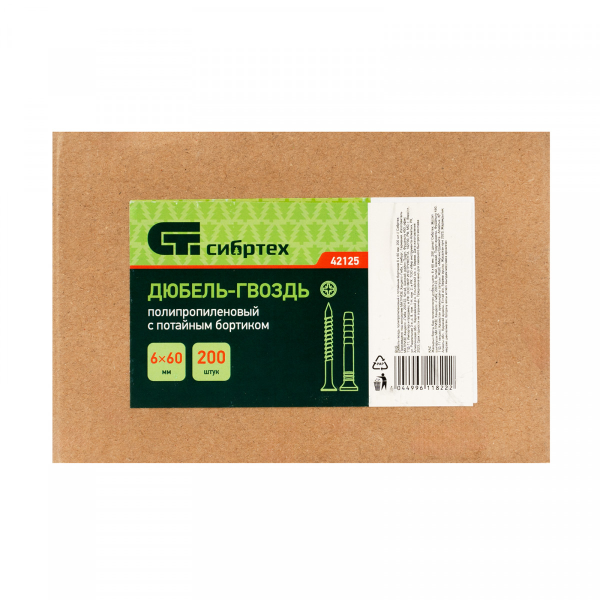 Дюбель-гвоздь полипропиленовый с потайным бортиком 6 х 60 мм, 200 шт Сибртех