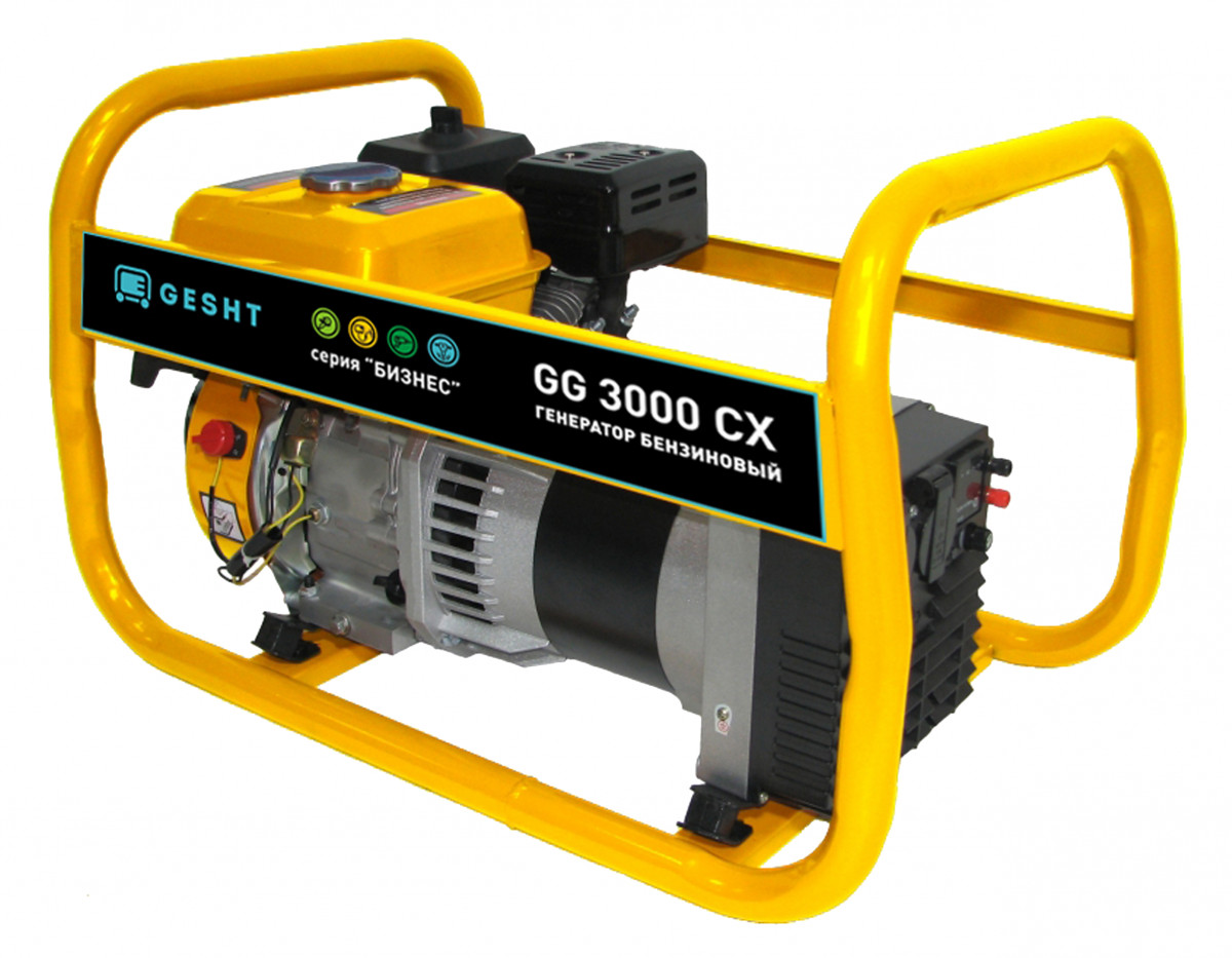 Бензиновый генератор Gesht GG3000CX разработан для подачи энергии до 2.8 кВт. Удобная конструкция позволяет легко транспортировать компрессор. Замена внешнего корпуса на стальную раму исключает все дребезжащие детали. Генератор выдает 220 В при силе тока в 16 А. Стабильную работу обеспечивает двигатель собственного производства. Данная модель считается полупрофессиональной и подходит как для дома, так и для небольших бизнес-объектов: кафе, магазинов, автомастерских и иных.
