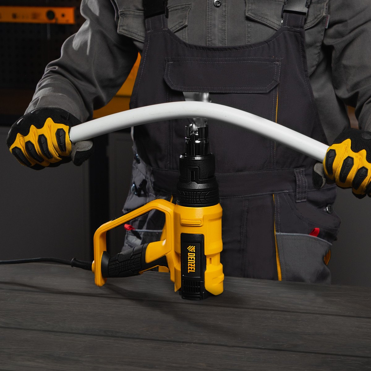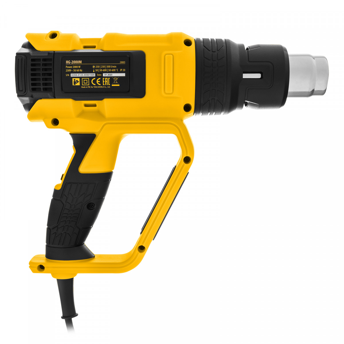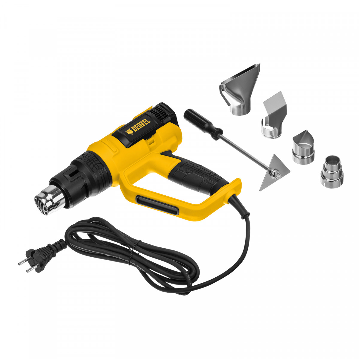 Фен технический Denzel HG-2000M 28005 мощностью 2000 Вт, с 3 режимами работы, подходит для снятия лака и краски с различных поверхностей, размораживания и пайки труб, создания изгиба в пластиковых деталях, генерации точечного теплового потока для нагрева небольших участков и др. Справиться с этими задачами помогает треугольный скребок и 4 насадки: плоская, полукруглая, отражающая и редукционная.,Мощность фена 2 кВт обеспечивает стабильную производительность на уровне 250/500 л/мин, в зависимости от выбранного режима. Температура выходящего потока составляет 50/50-450/50-600 ℃.