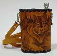 Фляга из нержавеющей стали, обшитая натуральной кожей с художественным оформлением.