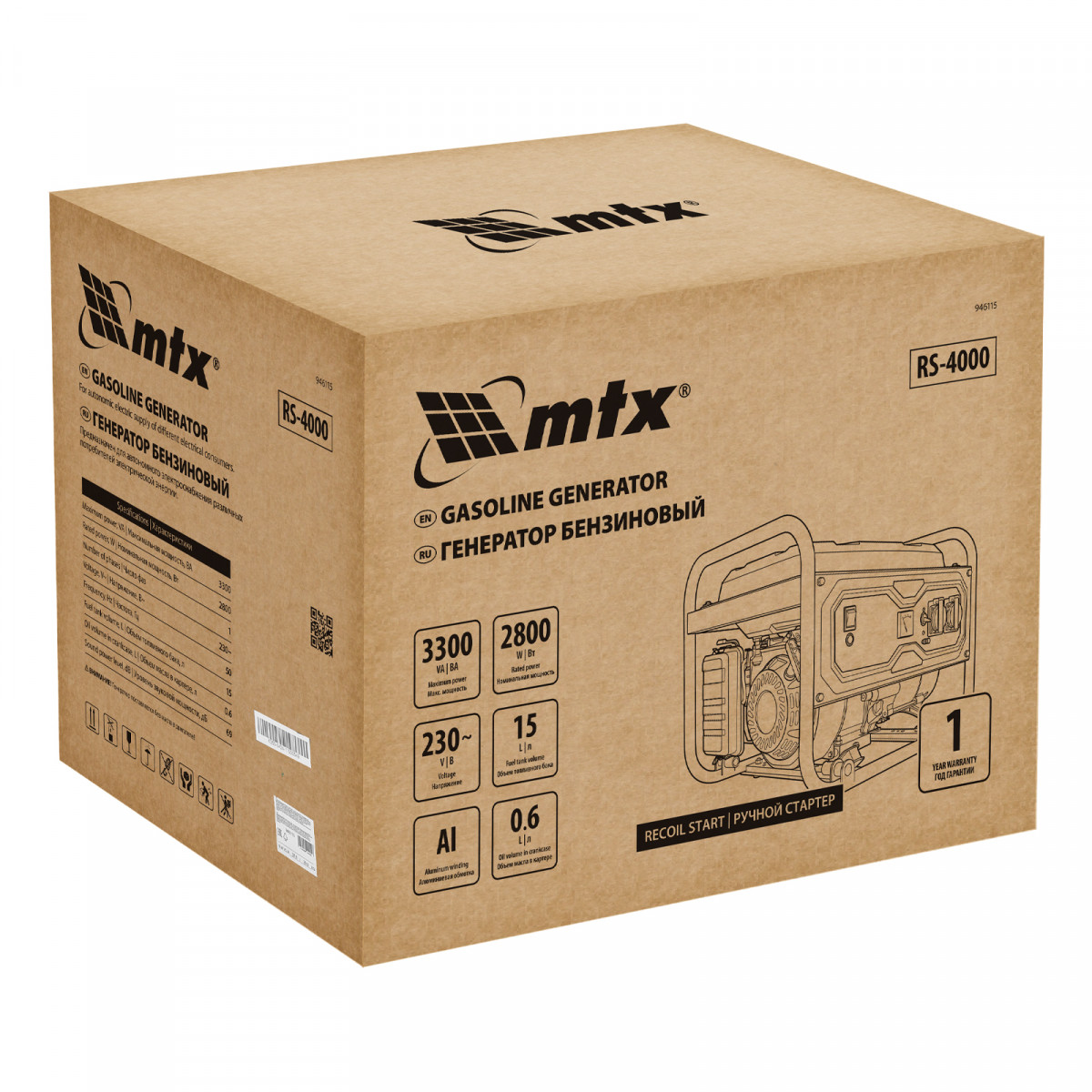 Генератор бензиновый RS-4000, 3,3 кВт, 230В, ручной стартер MTX