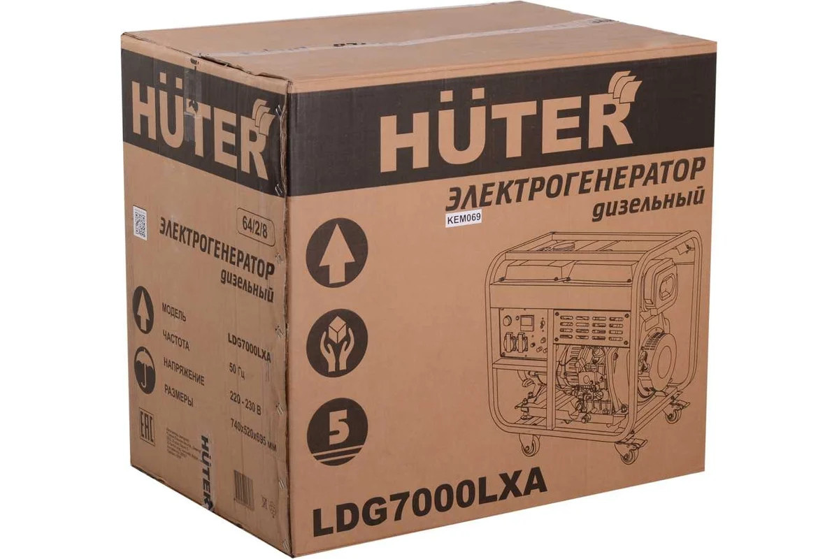 Дизельный генератор данной модели относится к переносным электростанциям, но его вес составляет 114,8 кг. Комплектуется комплектом колес для удобства перемещения. Запускается от ручного и электростартера, работающего от аккумулятора 12 В. Емкость для смазочной жидкости вмещает 1700 мл. Благодаря этому, генератор Huter LDG 7000LXА может работать длительное время без дозаправки.
