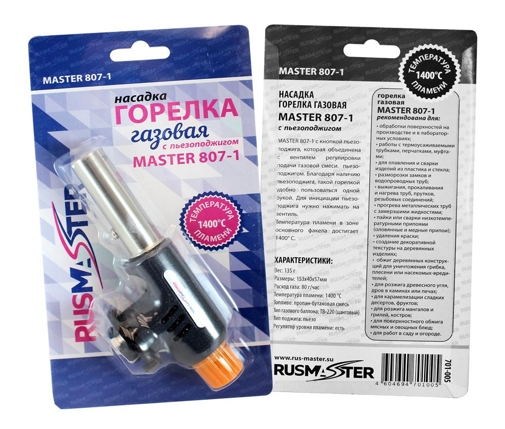 MASTER 807-1 с кнопкой пьезоподжига, которая объединена с вентилем регулировки подачи газовой смеси. пьезоподжигом. Благодаря наличию пьезоподжига, такой горелкой удобно пользоваться одной рукой. Для инициации пьезоподжига нужно нажимать на вентиль.