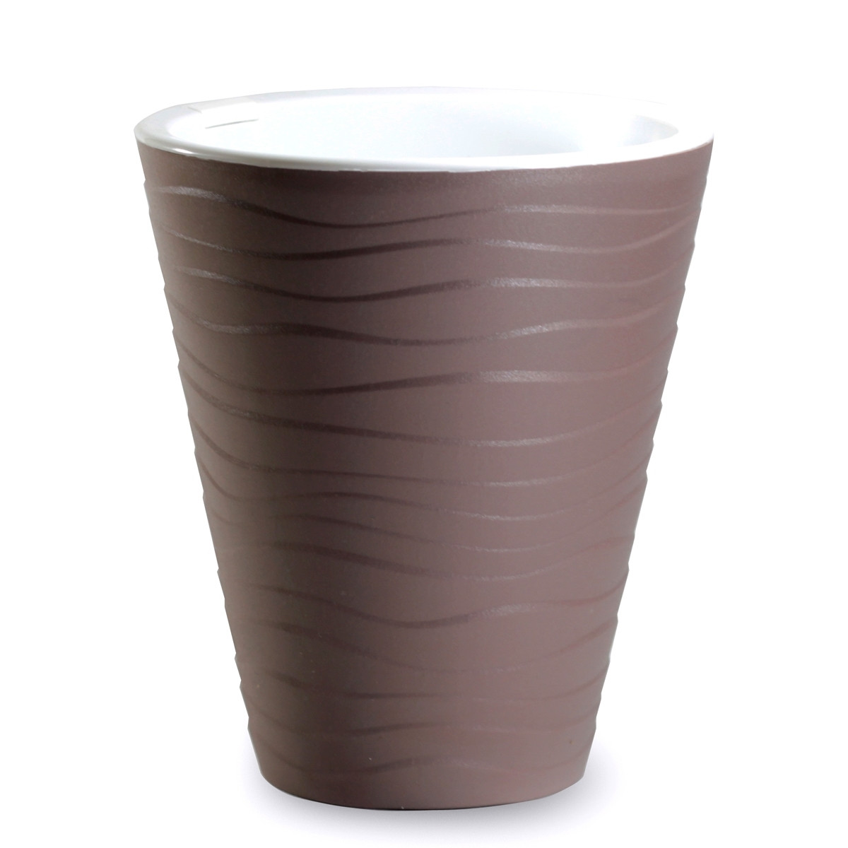 Кашпо «Валенсия» состоит из двух частей: декоративного горшка и дренажной вставки с отверстиями. Такая конструкция упрощает уход за растением, обеспечивает эффективный отвод лишней воды и вентиляцию корневой системы, занимает меньше места, чем обычный горшок с поддоном. Изделие изготовлено из пластика. Поверхность матовая, цвет «мокко». Кашпо может использоваться для выращивания комнатных и уличных растений. Материал не морозостойкий, поэтому с наступлением холодов изделие рекомендуется убрать с открытого балкона или со двора в помещение. Размеры кашпо 38х30х28,5 см. Объем контейнера для земли 2 л, отсека для воды — 0,2 л. Диаметр, см: 15,5. Высота, см: 16,2.