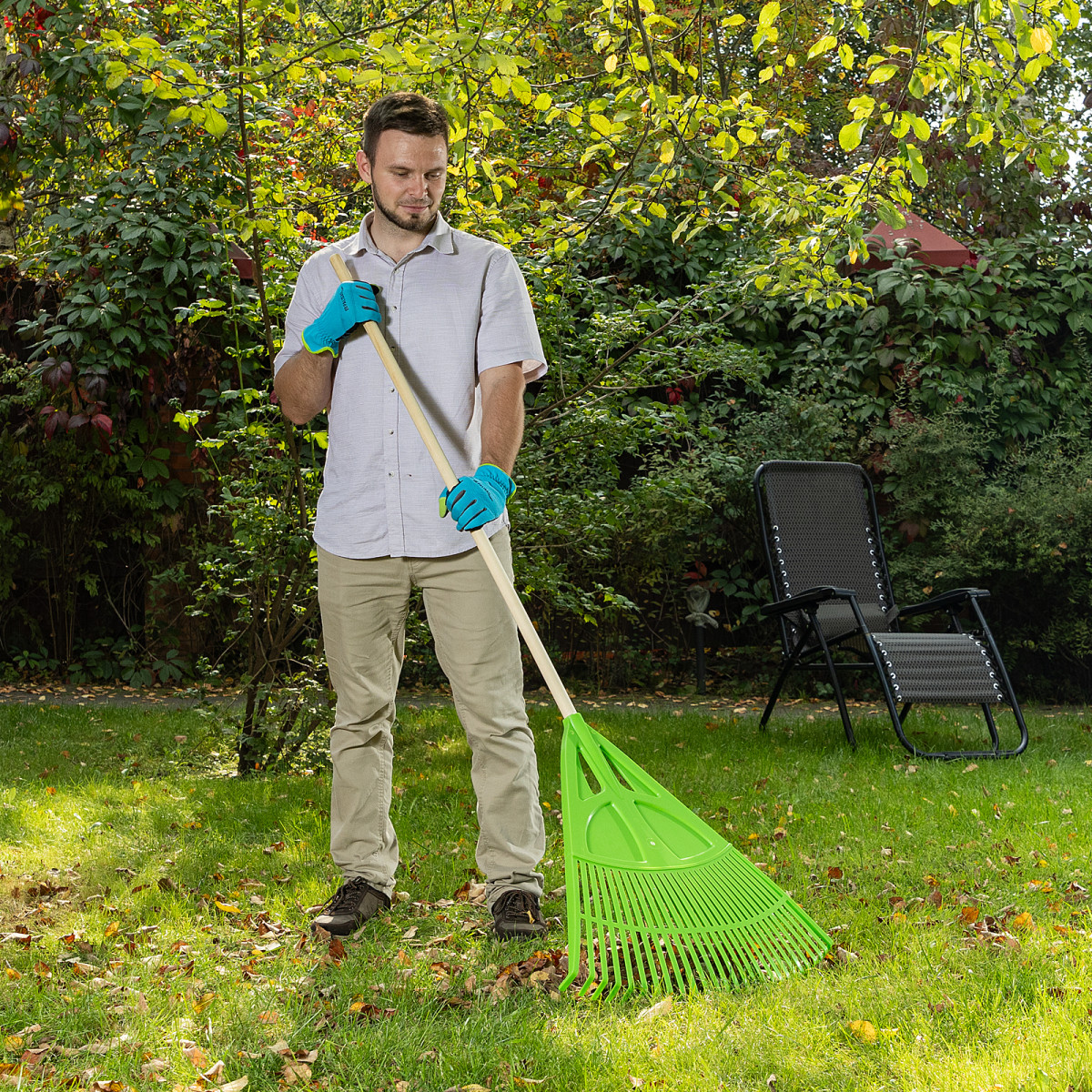 Веерные пластиковые грабли Palisad 61709 с 27 плоскими зубьями, с рабочей частью шириной 620 мм, без черенка, предназначены для уборки мелкого мусора и листьев с газонов и грядок. Благодаря плоским зубьям эффективно очищают территорию, не повреждая растительность. Грабли совместимы с черенками под тулейку диаметром 25 мм.