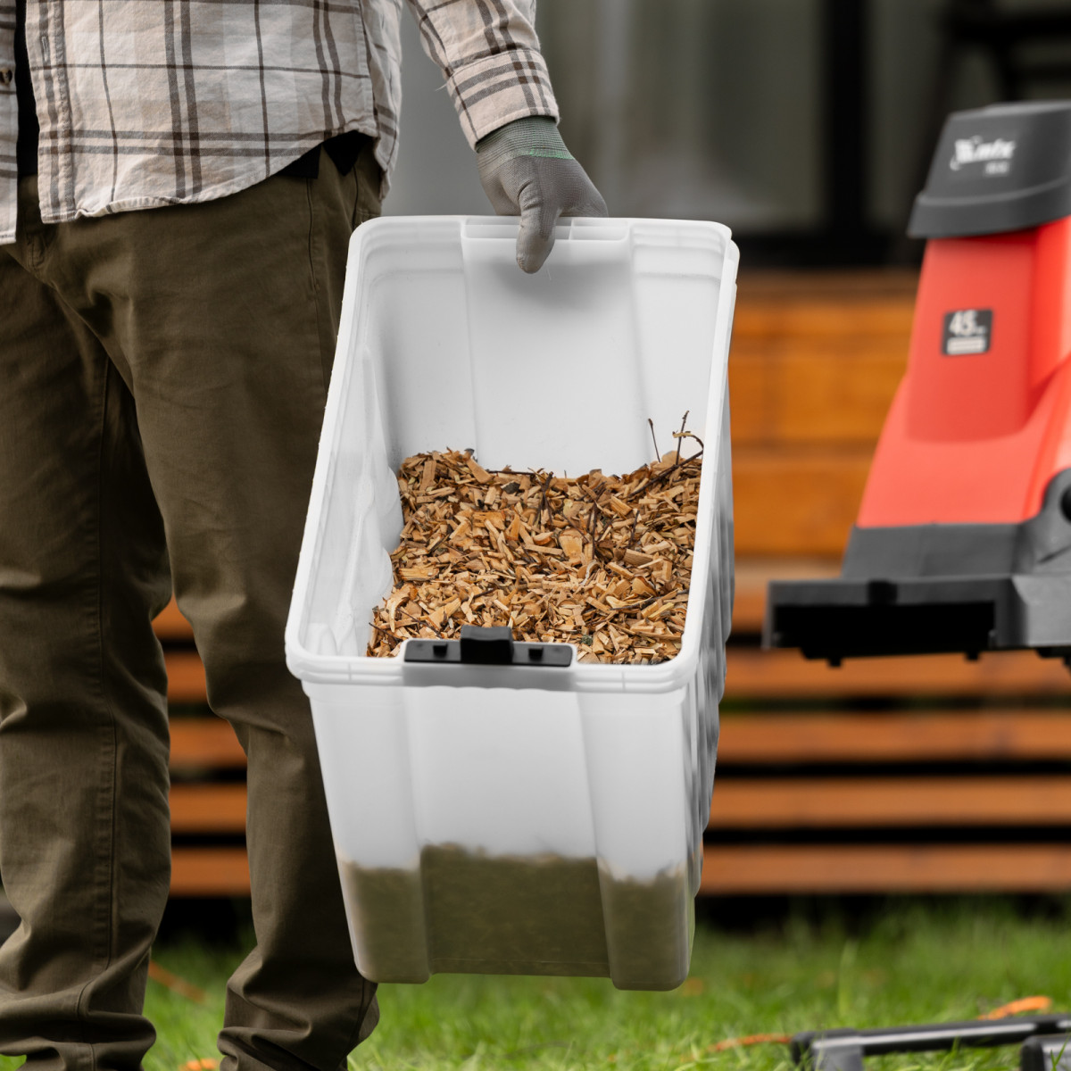 - Мобильность — благодаря колесам измельчитель удобно перемещать по участку.