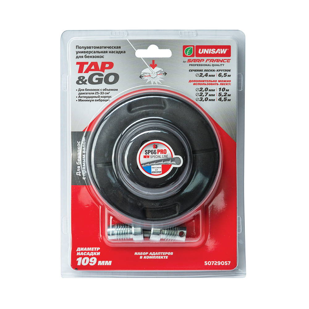 Насадка универсальная Unisaw Professional Quality TAP&GO 109 мм для бензокос с прямым валом и объемом двигателя 25-33 см³. Корпус из ударопрочного полипропилена гарантирует длительный срок службы насадки. В комплекте набор адаптеров для установки на большинство моделей с прямым (неизогнутым) валом и рабочим объемом от 25 до 33 куб.см. Инновационная износостойкая леска SP66, заправленная в насадку, с особой формой сечения, обеспечивает отличные режущие способности, снижая расход топлива, а также нагрузку на редуктор и двигатель.
