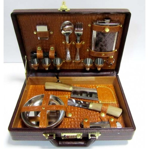 Внутренняя отделка кейса – натуральная кожа.Фляга – 1 шт. 9унц.Воронка для фляжки – 1 шт.Нож складной – 1 шт.Нож туристический – 1 шт. в кожаном чехле.Тяпка – 1 шт. нержавеющая сталь.Зажигалка – 1 шт.Штопор – 1 шт.Рюмки – 5 шт. нержавеющая сталь.Вилки – 5 шт.Ложки – 5 шт.Тарелки – 5 шт.Фонарик – 1 шт.
