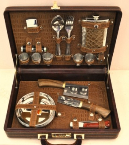 Внутренняя отделка кейса – кож. зам.Фляга – 1 шт. 9унц.Воронка для фляжки – 1 шт.Нож складной – 1 шт.Нож туристический – 1 шт. в кожаном чехле.Тяпка – 1 шт. нержавеющая сталь.Зажигалка – 1 шт.Штопор – 1 шт.Рюмки – 5 шт. нержавеющая сталь.Вилки – 5 шт.Ложки – 5 шт.Тарелки – 5 шт.Фонарик – 1 шт.