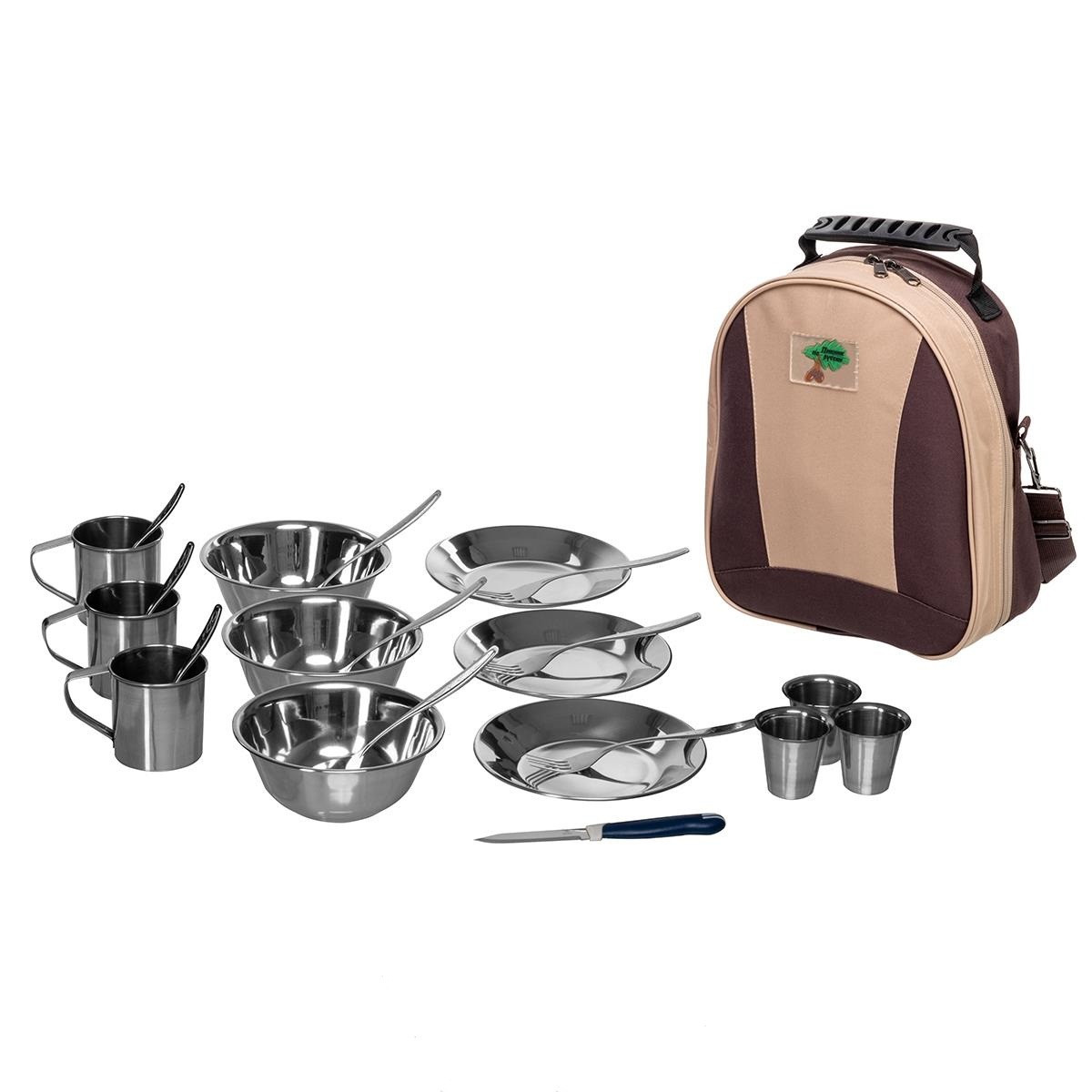 Вся необходимая посуда, чтобы три человека в любой момент могли быстро перекусить или плотно поесть в дороге или на природе, помещается в совсем небольшой кейс. Предметы для приема пищи изготовлены из легкой, прочной, долговечной нержавеющей стали, удобно упаковываются в специальные отсеки кейса и потому всегда будут под рукой. КОМПЛЕКТАЦИЯ • Кружка Ø 7 см/высота 8 см: 3 шт; • Стопка Ø 6 см/высота 6 см: 3 шт; • Тарелка Ø 20 см: 3 шт; • Миска глубокая Ø 16 см/глубина 6 см: 3 шт; • Ложка столовая: 3 шт; • Вилка: 3 шт; • Ложка чайная: 3 шт; • Нож: 1 шт.