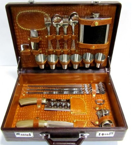 Внутренняя отделка кейса – натуральная кожа.Фляга – 1 шт. 16 унц.Нож складной – 1 шт.Нож туристический – 1 шт.Тяпка 5 мм – 1 шт. нержавеющая сталь.Зажигалка – 1 шт.Штопор – 1 шт.Рюмки – 6 шт. нержавеющая сталь.Вилки – 6 шт.Ложки – 6 шт.Шампура – 6 шт.Тарелки – 6 шт.
