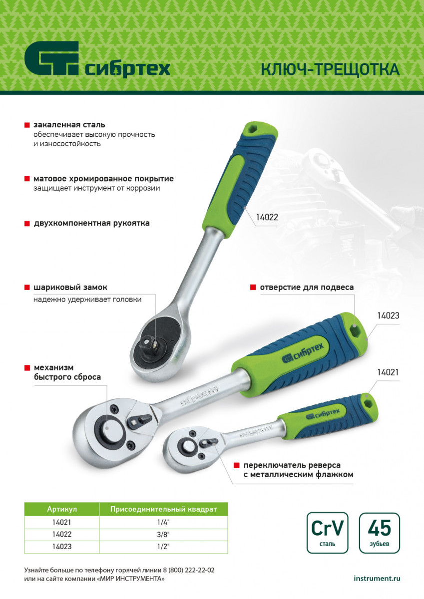 Ключ-трещотка Сибртех 14021 с присоединительным квадратом 1/4", функцией быстрого сброса и храповым механизмом с 45 зубьями, имеет покрытие «матовый хром» и используется с торцевыми головками, имеющими посадочное гнездо соответствующего размера. Предназначен для закручивания и раскручивания резьбового крепежа. Храповой механизм с 45 зубцами обеспечивает плавное вращение. Ключ применяется для ремонта автомобилей, техники и оборудования, пригодится также дома и на даче.