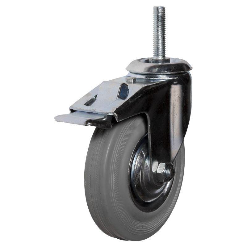 Колесные опоры с тормозом из серой резины используется в производстве мебели, медицинского и торгового оборудования, используемого в помещениях.Шина: литая серая резина. Обод из оцинкованной стали, роликоподшипник. Имеет плавный и бесшумный ход.Кронштейн изготовлен из оцинкованной стали, имеет шариковый подшипник.Максимальная допустимая скорость 4км/час . Колеса из серой резины не оставляют следов на покрытии пола.
