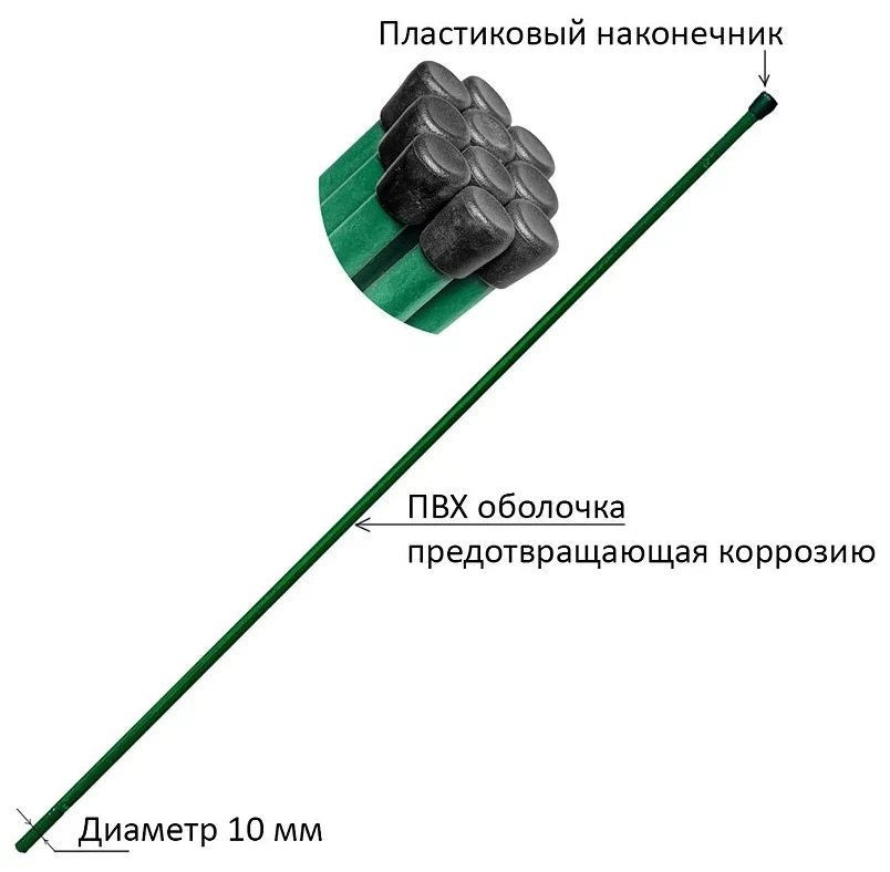 Колышки используется в качестве опоры для садовых растений.Конструкция из стальной трубы с ПВХ покрытием отличается прочностью и устойчивостью к образованию коррозии. Срез трубы сверху снабжен колпачком.