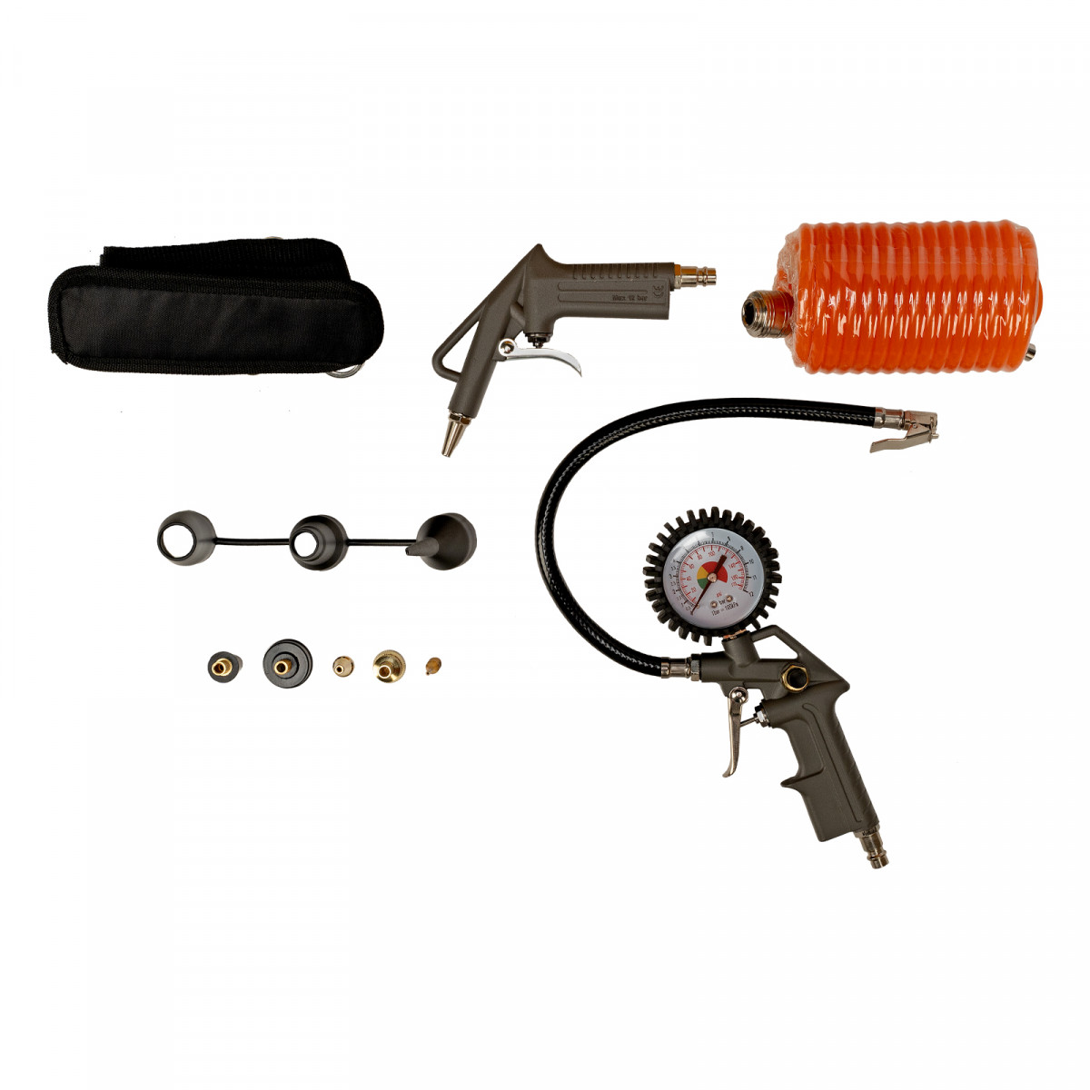 - Набор пневмоинструмента в комплекте — к устройству прилагается пистолет для накачивания с манометром, продувочный пистолет, пневматический шланг, а также набор пневмосопел и переходников.
