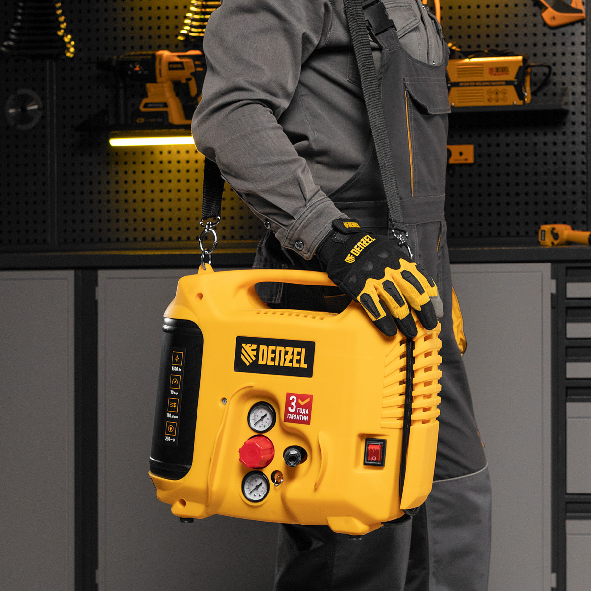 - Комфортное перемещение — компрессор оснащен ручкой и комплектуется плечевым ремнем.