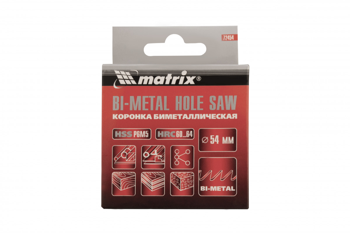Коронка Matrix BIMETAL 72454 диаметром 54 мм — режущий инструмент, который устанавливается на дрель, перфоратор или стационарный станок. Используется для быстрого сверления черных и цветных металлов, пластика и других материалов. Позволяет получить отверстия большого диаметра при проведении электромонтажных работ и прокладке коммуникаций.