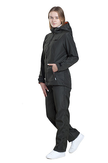 Удобный и современный женский костюм для прогулок и активного отдыха на природе. Из современной трехслойной ткани ПОНЖИ. Ткань прочная и дышащая, с водоотталкивающим покрытием, быстро сохнет и обеспечивает воздухообмен. В этой куртке вы будете чувствовать себя защищенной от влаги и ветра в холодное демисезонье. Приталенная куртка на молнии удлиненная сзади с двумя карманами в рельефах и одним внутренним будет удобна вам по фигуре. Капюшон с регулировкой по объему и глубине защитит лицо от влаги и ветра. Комбинезон с завышенной талией сзади небольшой спинкой для защиты от холода.