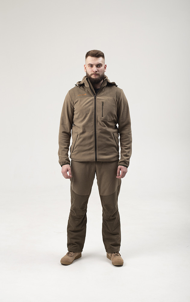 Костюм флисовый с отделкой из нешуршащего материала. Идеально подойдет для охоты и активного отдыха загородом. Куртка с застежкой на молнию, имеется три кармана на молнии, отстегивающийся капюшон с утяжкой по краю, низ рукавов и низ куртки собраны на окантовочную резинку.