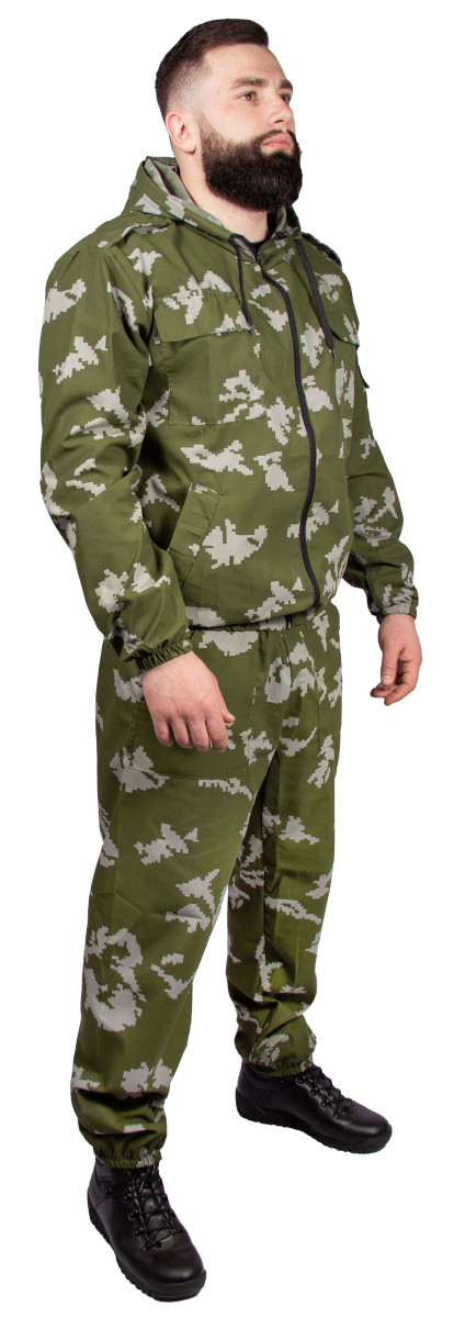 Костюм маскировочный летний выполнен из смесовой ткани-сетки, в составе которой 65% хлопка /20% вискозы и 15ПЭ. Это позволяет изделию сохранять цвет при многократных стирках, а также придаёт высокую износостойкость. Костюм состоит из куртки и брюк. Прекрасно подойдет любителям активного отдыха на природе. В костюме комфортно в жаркую погоду, а также, благодаря свободному покрою его можно одевать поверх одежды как защитный слой. Куртка свободного покроя на молнии с капюшоном. 3 кармана на куртке. Пояс брюк на резинке. Низ брюк на резинке.