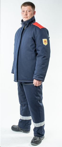 Материал верха: 100 % х/б с огнестойкой пропиткой, 350 г/м2 , Подклад: бязь, 100% хлопок. Утеплитель: синтепон 150г/м² (3слоя - полочки, спинка, 2слоя – рукава, 2 слоя - брюки). Имеются документы: сертификат, заключение Минпромторга