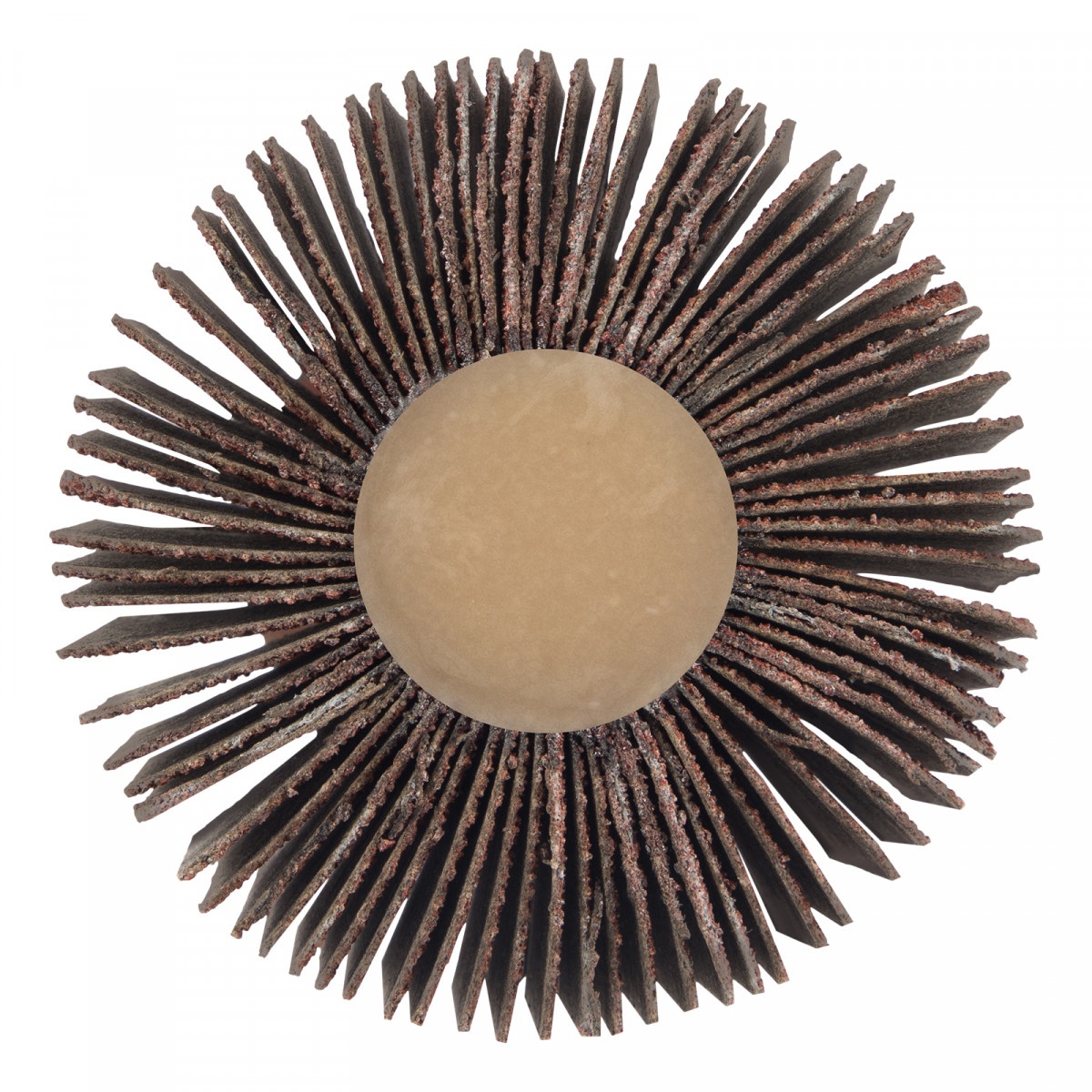 - Надежность — лепестки из прочной х/б ткани прикреплены к оправке при помощи бакелитовой смолы, поэтому круг устойчив к трению и давлению.