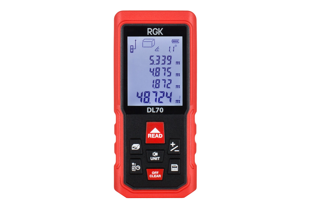 Лазерный дальномер с угломером RGK DL70 4610011873911 предназначен для измерения расстояния до 70 метров. Оснащен большим количеством функций: сложение/вычитание, измерение углов, площади и объема, измерение по Пифагору, режим непрерывного измерения и т.д. Дисплей прибора имеет подсветку, что облегчает считывание данных при слабом освещении. Класс пыле-влагозащиты IP54 позволяет работать на запыленных площадках или во время дождя. В случае возникновения ошибки измерения раздается звуковой сигнал.