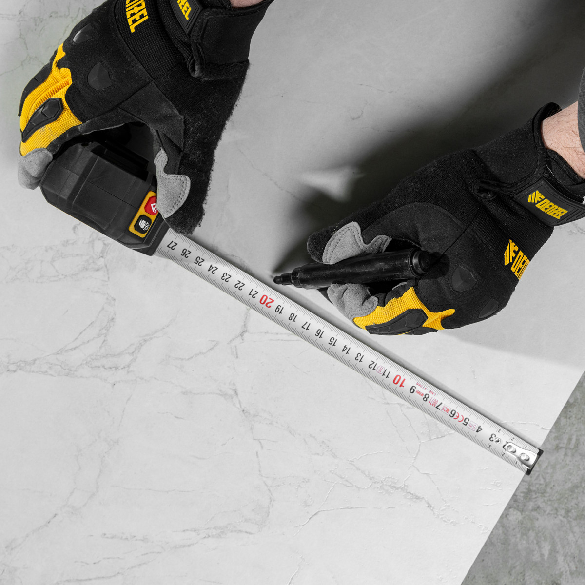 - Удобное использование рулетки — конструкцией предусмотрена автоматическая фиксация измерительного полотна, магнитный зацеп надежно фиксируется на металлических поверхностях.
