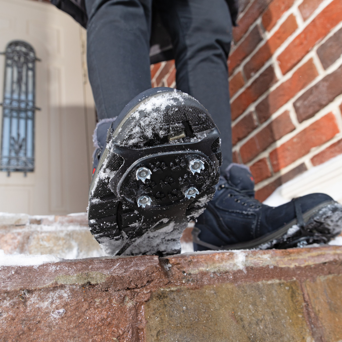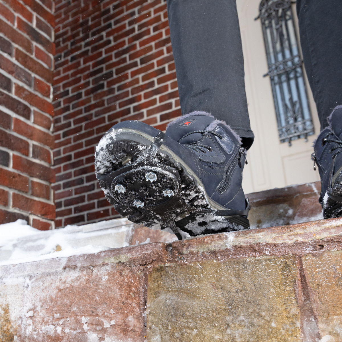 - Эффективная защита от падений — стальные шипы не гнутся и не истираются, заостренные зубцы глубоко проникают в лед.