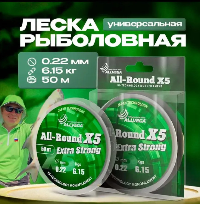 Леска монофильная ALLVEGA All-Round X5 50м 0,22мм (6,15кг) прозрачная идеально подходит для рыбалки любого типа и уровня сложности.