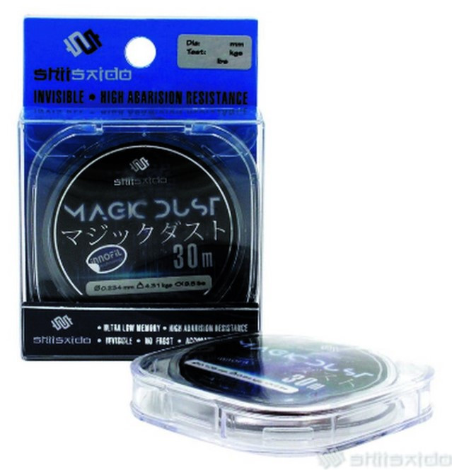 Леска имеет неплохую устойчивость к разрыву на узлах. Также Magic Dust устойчива к абразивному воздействию. Монолеска мягкая и хорошо сдерживает агрессивные поклевки. Серия Magic Dust выпускается в размотке 30 м.
