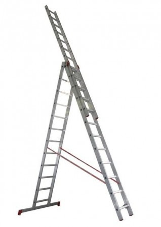 Профессиональная алюминиевая трехсекционная лестница выдержит большие нагрузки благодаря уникальной конструкции рамы, широкой траверсе, которая обеспечивает устойчивость всей конструкции. Специальный рельеф ступеней препятствует скольжению при использовании лестницы. Лестница снабжена самозахватывающими фиксирующими крюками, которые препятствуют самопроизвольному рассоединению секций.Особенности: