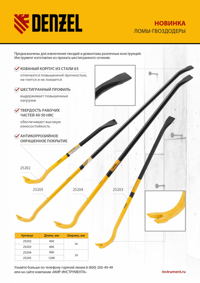 Кованый корпус из стали 65 обеспечивает прочность и надежность лома-гвоздодера Denzel 25202.